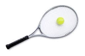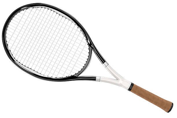 Tennis racquet is a bat with a long handle attached to a round frame with a network of tight strings over it; used to hit the ball in tennis